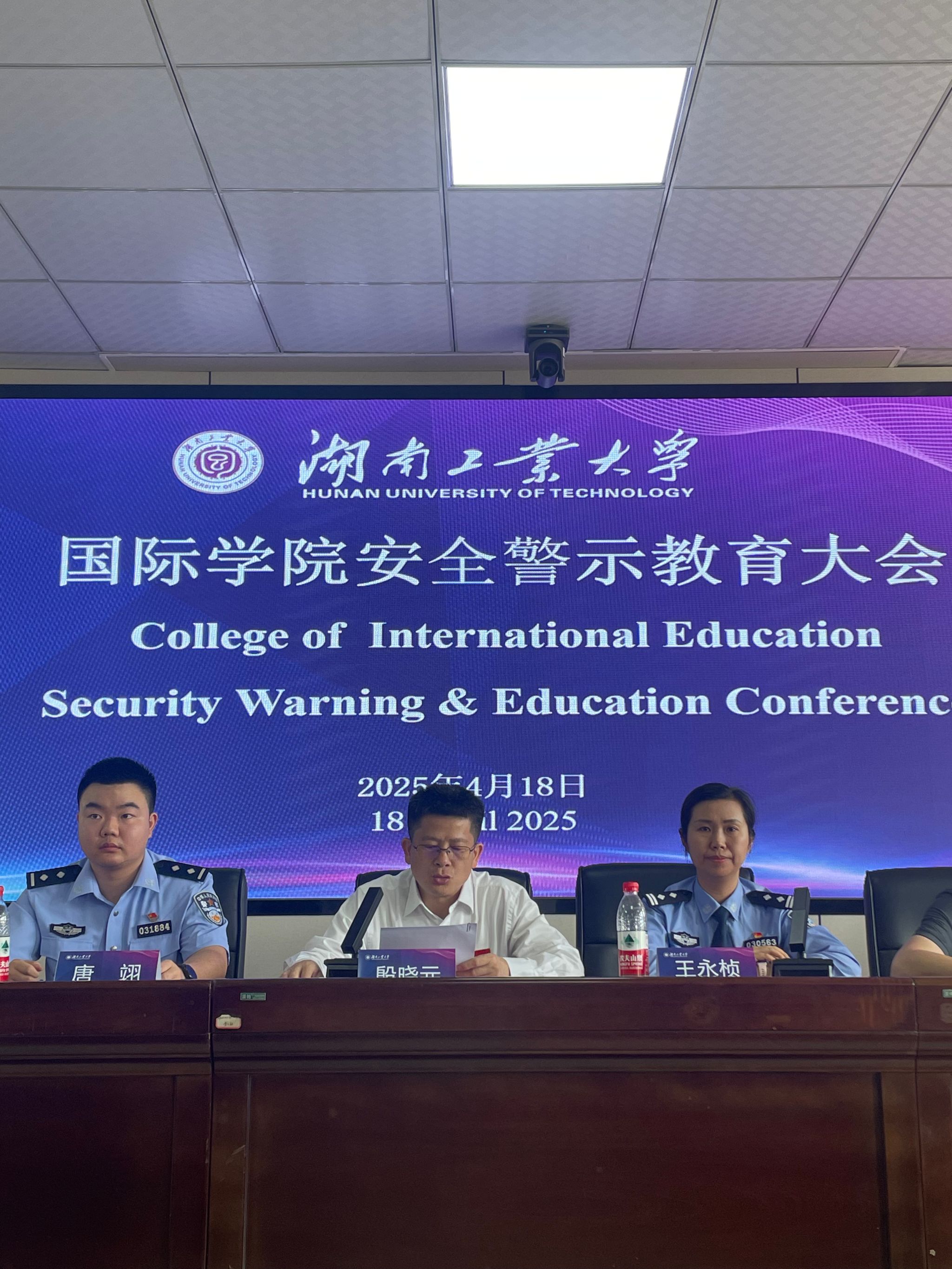 为切实做好来华留学生安全教育和管理工作,进一步增强来华留学生的安全观念和纪律意识,全力筑牢校园安全屏障,4月18日下午,国际学院召开来华留学生安全警示教育大会。我校副校长殷晓元出席并讲话。本次大会还特别邀请株洲市公安局人口与出入境管理支队境外人员管理大队负责人、新塘派出所负责人、保卫部负责人、学生工作部负责人作为宣讲嘉宾。国际学院全体师生参加本次大会。大会由国际学院院长刘曼主持。