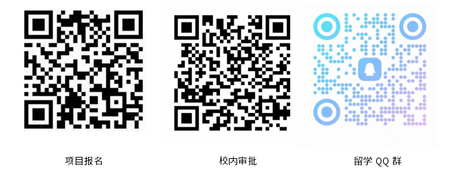 依次扫描下述二维码线上报名,下载申请、审批等表格(附件1~8),加入留学QQ群(群号:703914501)。首先填写《湖南工业大学学生出国(境)交流学习申请表》(附件1),将签名和按手印后的扫描版申请表电子档发送到国际合作与交流处(邮箱:huwenwen@hut.edu.cn),纸质文件交到湖南工业大学河西校区崇德楼513办公室(电话:0731-22183483)。